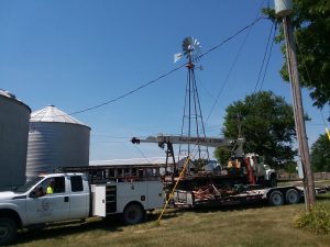 Replaced a junk A602 on this farm near Durham, MO. What a maze of overhead wires to dodge! Old, early style Aermotor tower was quite tired and required several girts and diagonal braces to be replaced. Tight as a drum now! Of course night light had to be mounted on the ladder leg -nice!