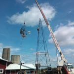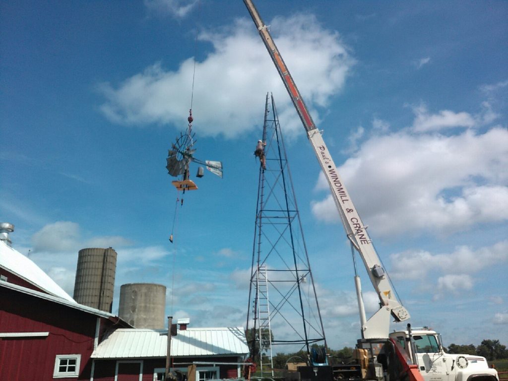 This 50′ tower was not very stable (note few girts & long diagonal strap braces). I think it was a Monitor tower. In any case, I rebuilt this cute 6′ Challenge 27 and re-installed it. Note mill was raised with tower stub and platform intact. Pumps water from shallow well for cattle. East of Dekalb, IL