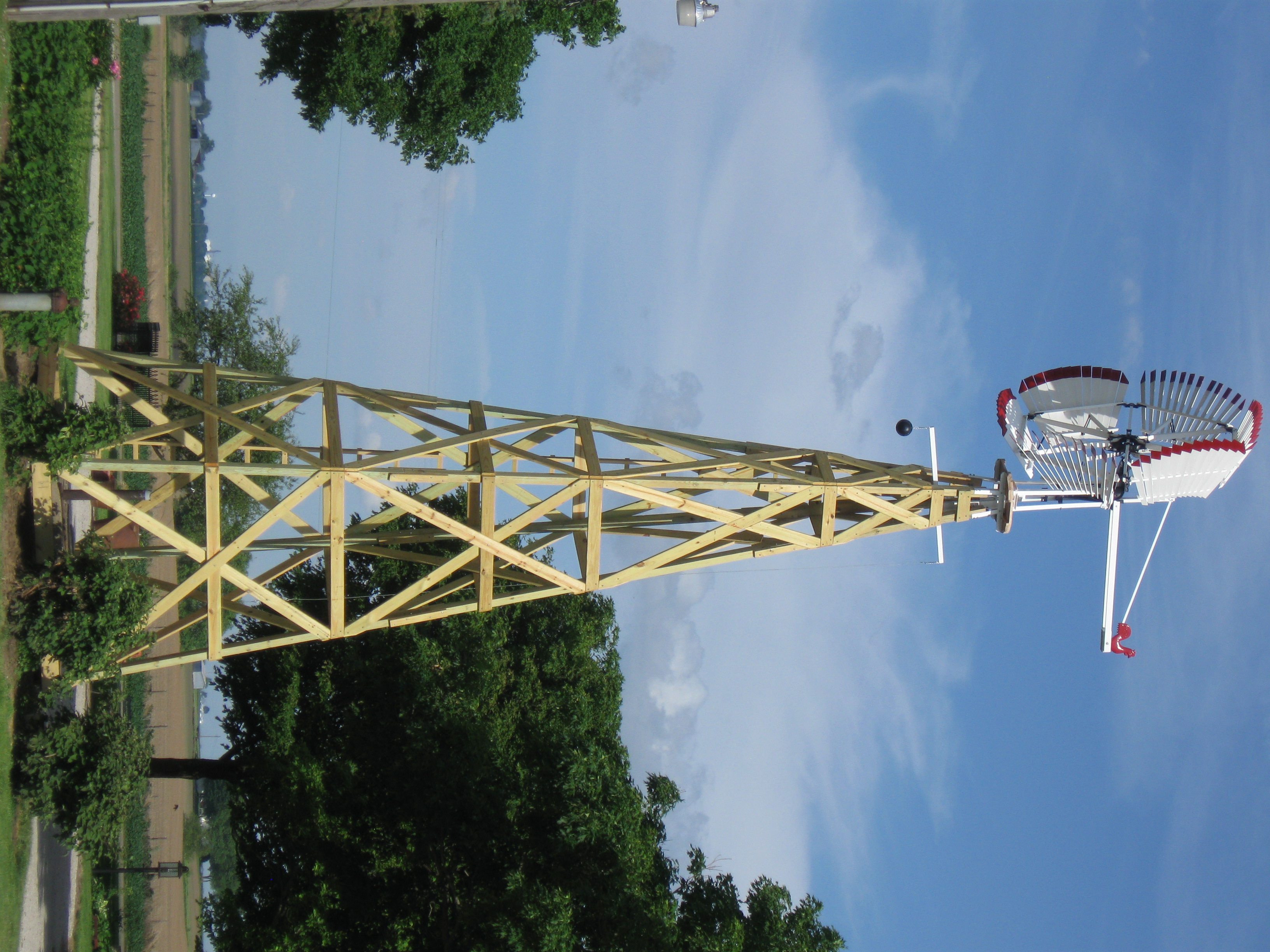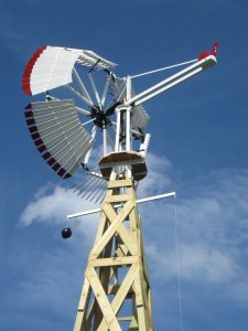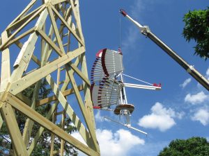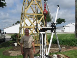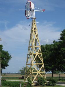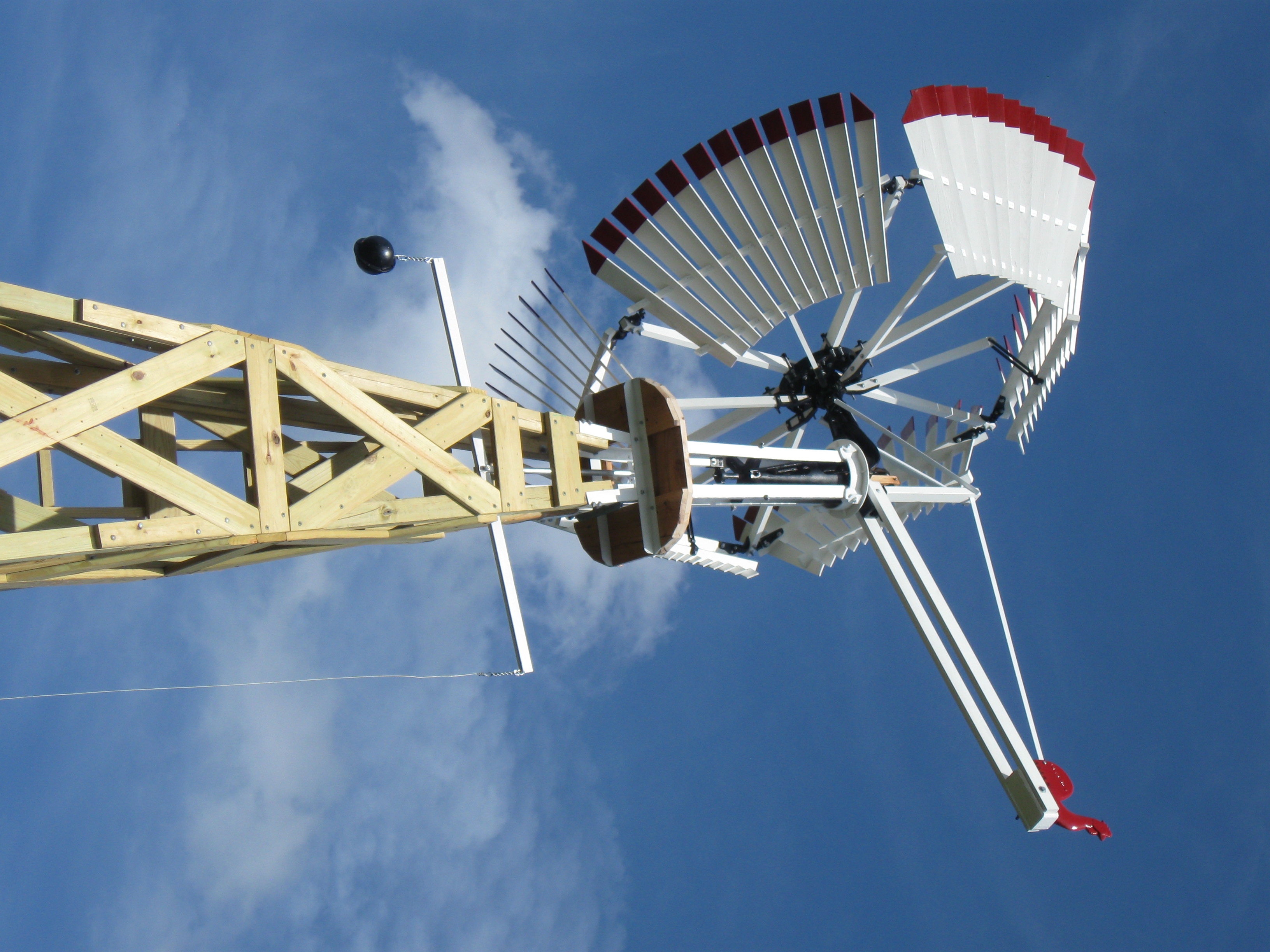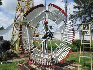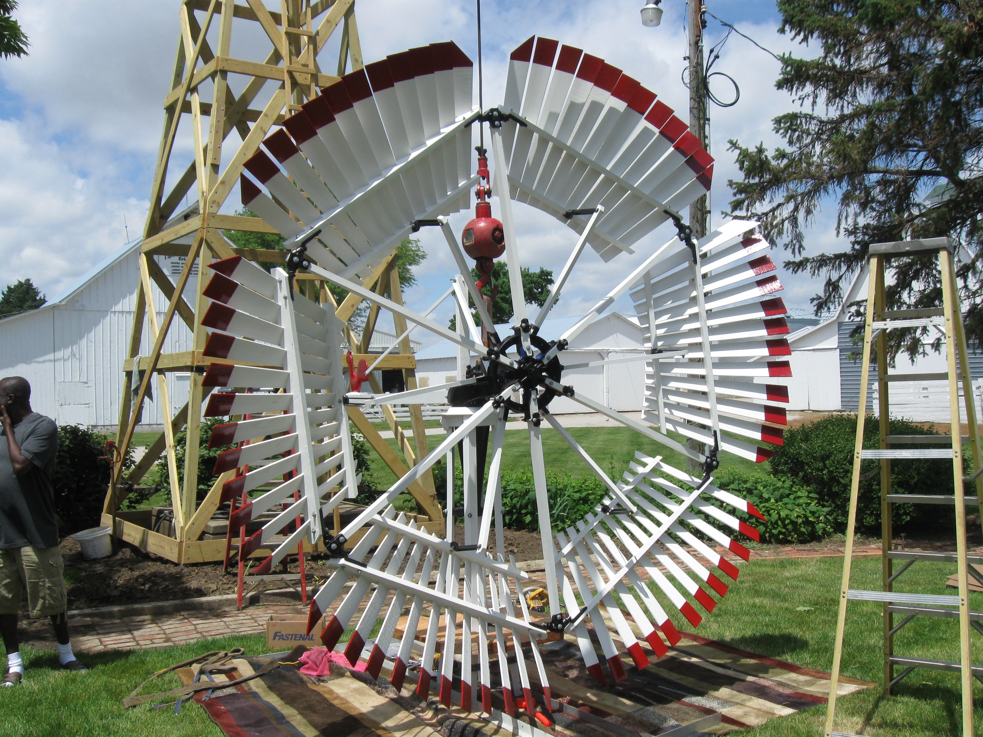 Enjoyed installing this rebuilt 10′ Elgin #2 Vaneless Windmill near Emden, IL.   I built a 40′ wooden tower for it which was later painted white to match the wooden blades.  The counter weight is a large, red cast iron chicken.  The black cast iron ball (beneath service platform) is weighted and is fundamental part of the governing mechanism.  Everything works beautifully. The mill is circa 1885 and has been on the same farm since new!