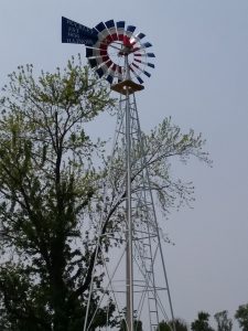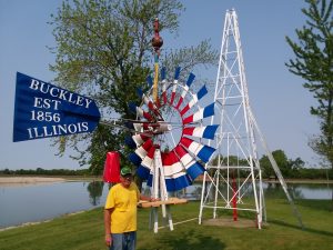 Working with the village of Buckley, IL, last Summer, I installed this rebuilt A702 at their city park. It mounted onto their existing Elgin 4-post tower. Pic shows windmill with 4′ stub ready to raise. Unfortunately, the old 2″ well was no longer serviceable so the mill could not go to work pumping into the pond. Powder coated paint job looks great! 2019