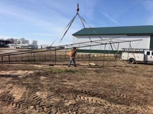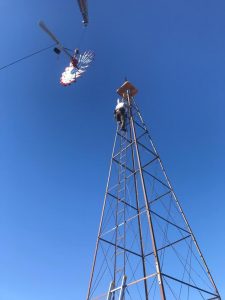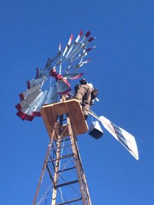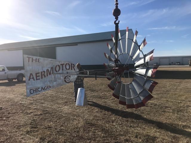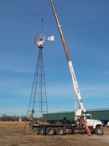 Just completed this project near Havana, IL. Customer had severely bent the old tower while taking it down, then, intentionally separated it into two halves to safely haul it. When he did, the tower literally collapsed onto itself! I wish I had a photo of this mill before we started the repairs and re-assembly, it was a mess! Vintage 4-post tower was 55′ tall and received a rebuilt Aermotor A702 on it. Customer wanted old Chicago logo painted on the tail and red tips on the wheel. Very sandy soil over there so we dig a bell shape at bottom of the anchor holes so concrete locks into earth better. Sunny photo is deceiving…it was 13 F degrees that morning!