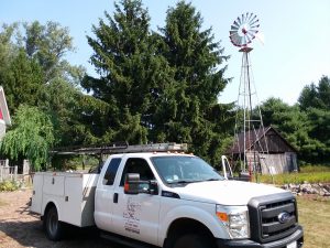 Long drive up to Sutton’s Bay, MI on the north shore of Lake Michigan but at least it was a beautiful drive! Old head was destroyed by bad storm (tall fir trees nearby probably contributed to the wild wind). Gin pole job. Job went smooth but little did I know when photo was taken that in another hour I would be sitting in huge traffic jam in Traverse City, MI…for another hour and half!-Arg!