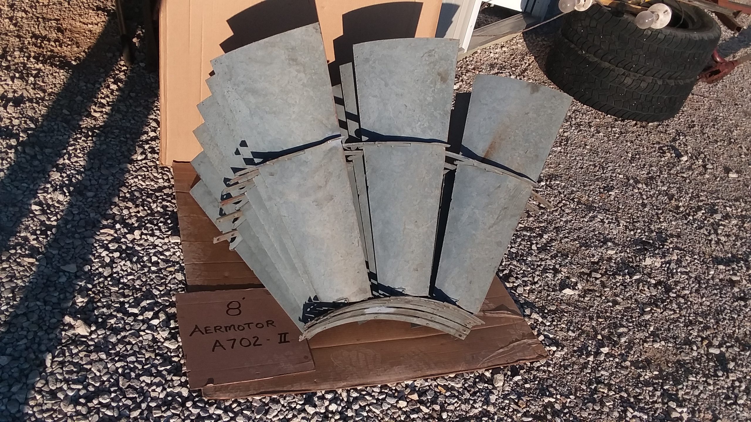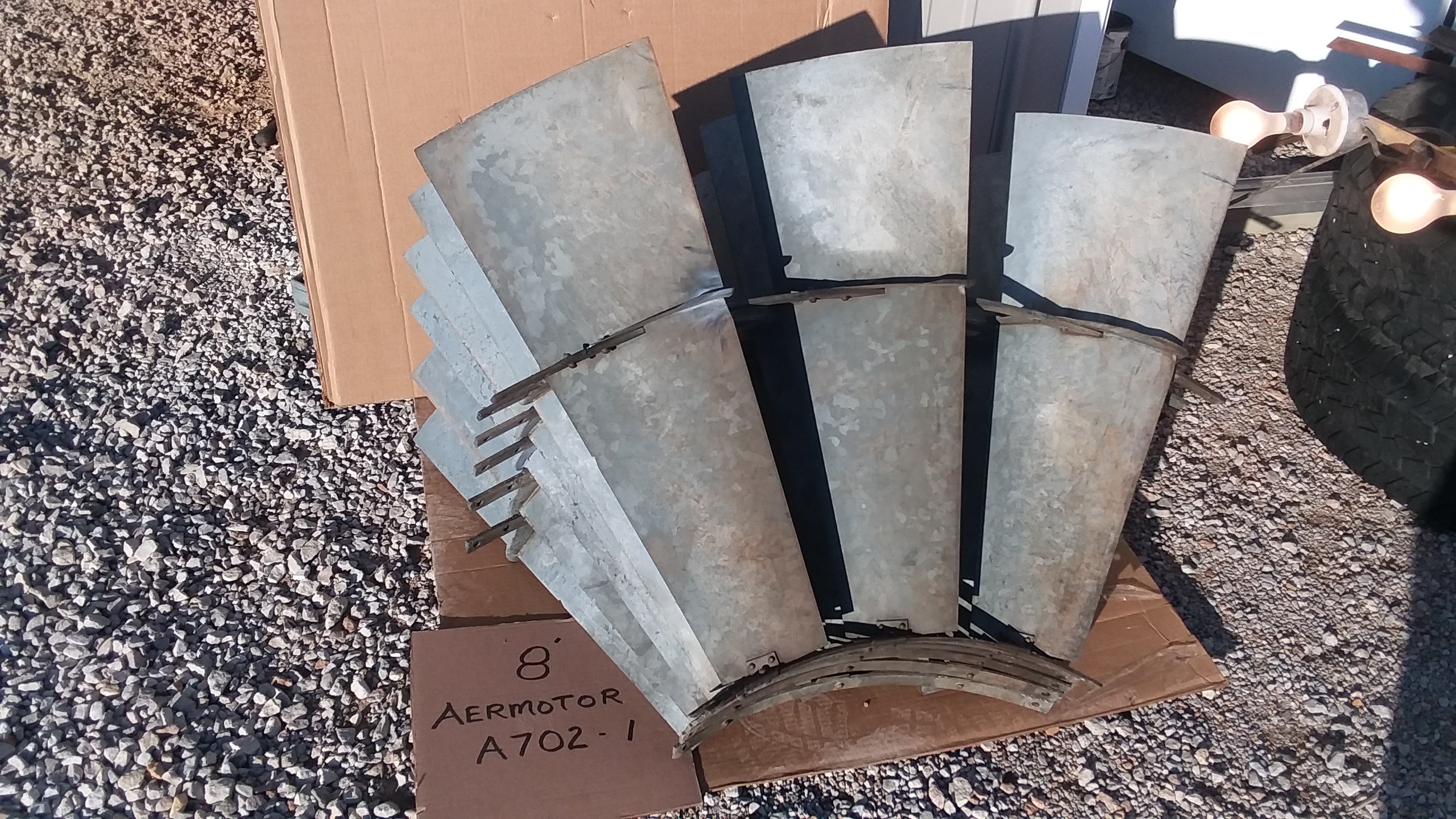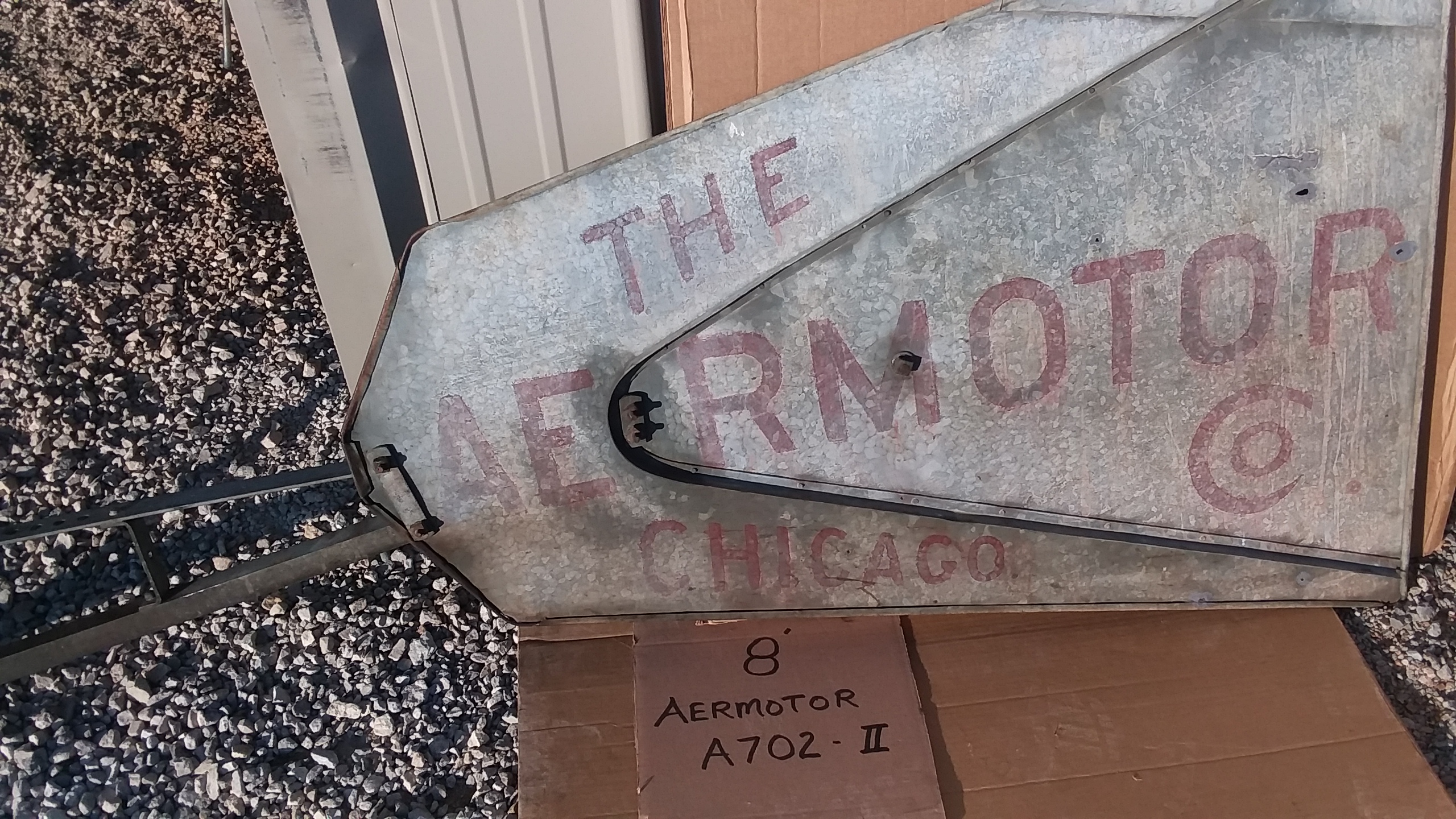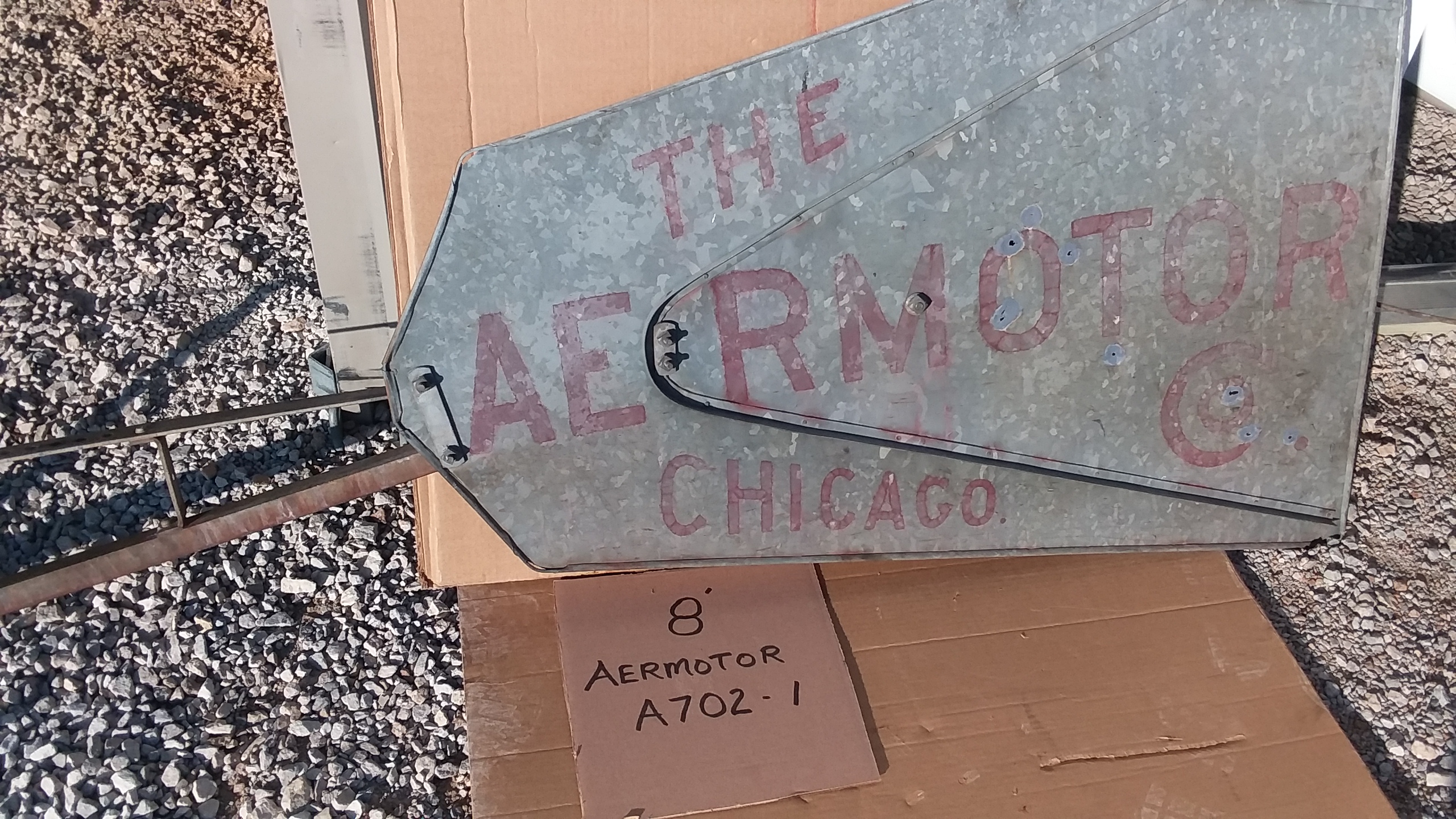 7) – 8′ A702 Aermotor. 100% professionally rebuilt. This is the most reliable and best built windmill in the world. 100% complete windmill with lots of new parts. New hot galvanized wheel / tail / hood. Includes new mast pipe, furl lever, instructions, and 5yr warranty. Does not include tower. Can provide with optional painted old Chicago Aermotor logo (both sides) for additional $100…. $3600.