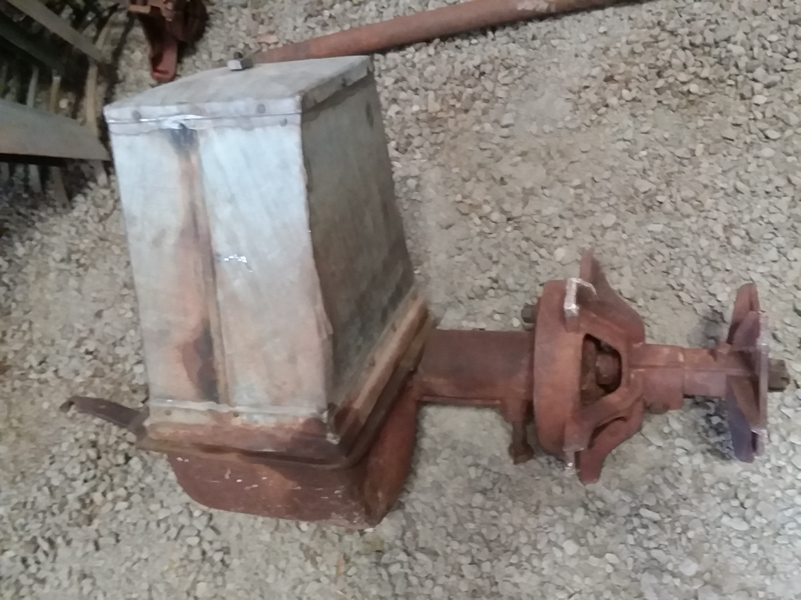 10′ Dempster, Vaneless Windmill (wooden wheel) -unrestored, circa 1910, includes all iron, repro horse c’weight, and new wooden wheel. New bearings and major machine work already completed. Great project mill! *Does NOT include tower.
