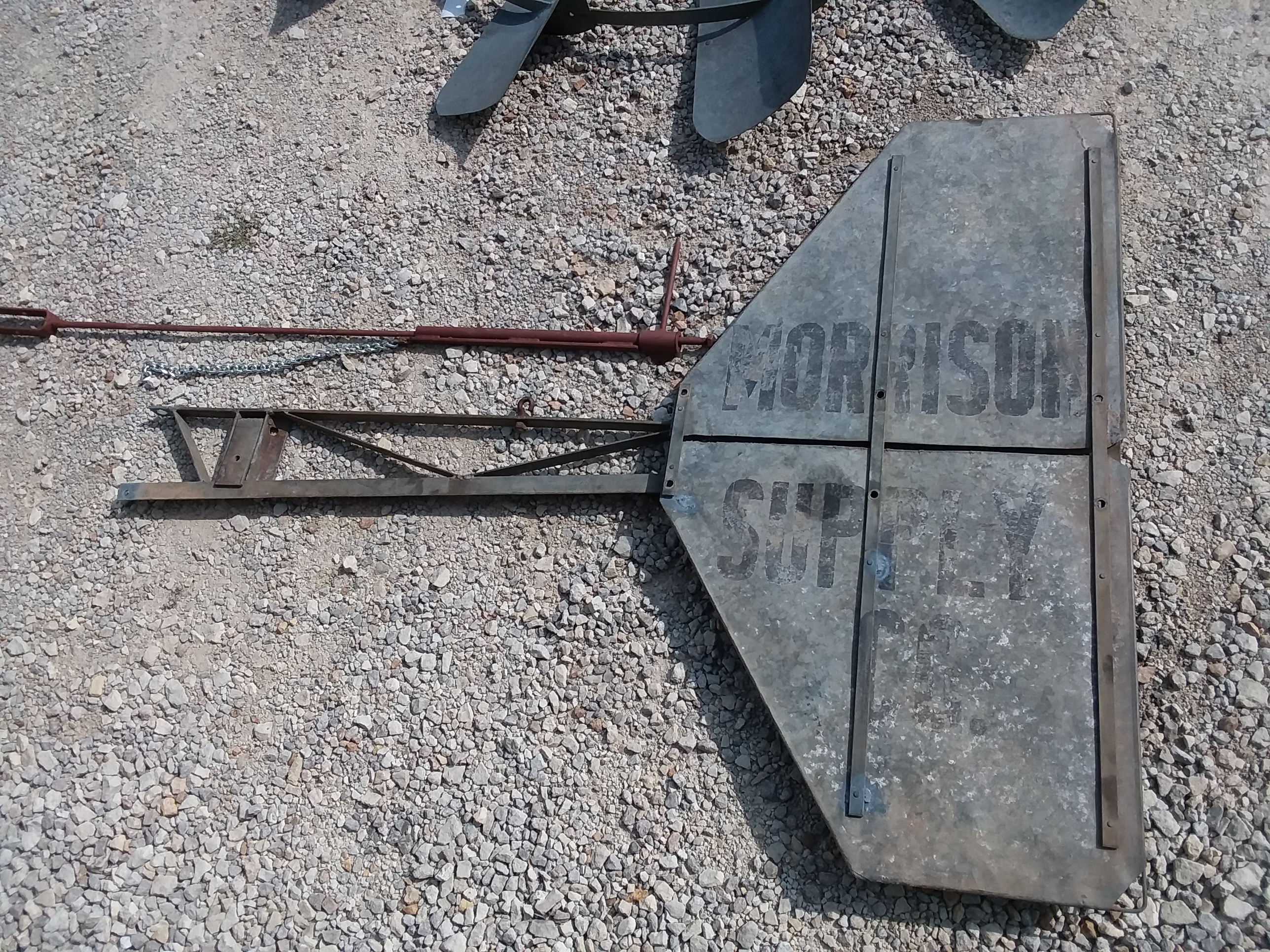 8′ Dempster Mod. 12 Windmill Head & Tower. Exceptionally nice vintage blades and tail vane. Decent lettering on tail (both sides), Thought to be 100% complete with tower castings, motor, wheel arms, mast pipe, gov. spring, wheel, tail, tail stem, brake mechanism, and pullout device. Selling in “as is” condition. Original wheel bearings are in very good, usable condition. One of the nicest original vintage windmill and tower I’ve ever had! Great condition and beautiful patina! Windmill head with matching 40′ tower. NICE!