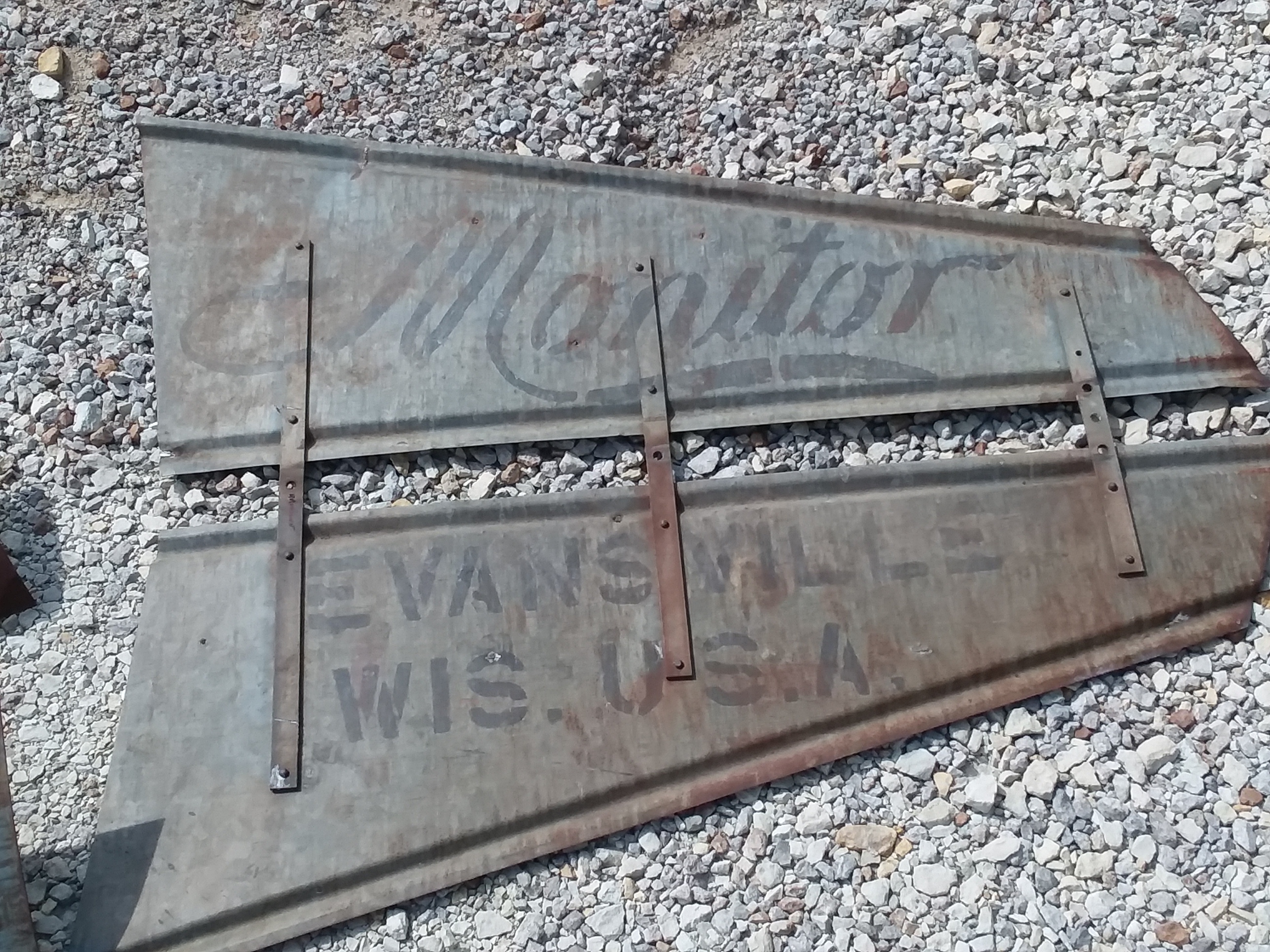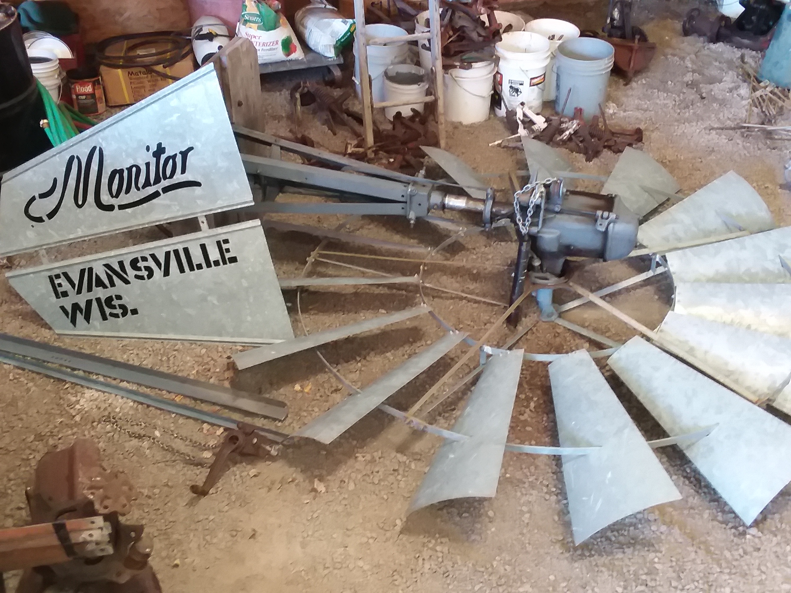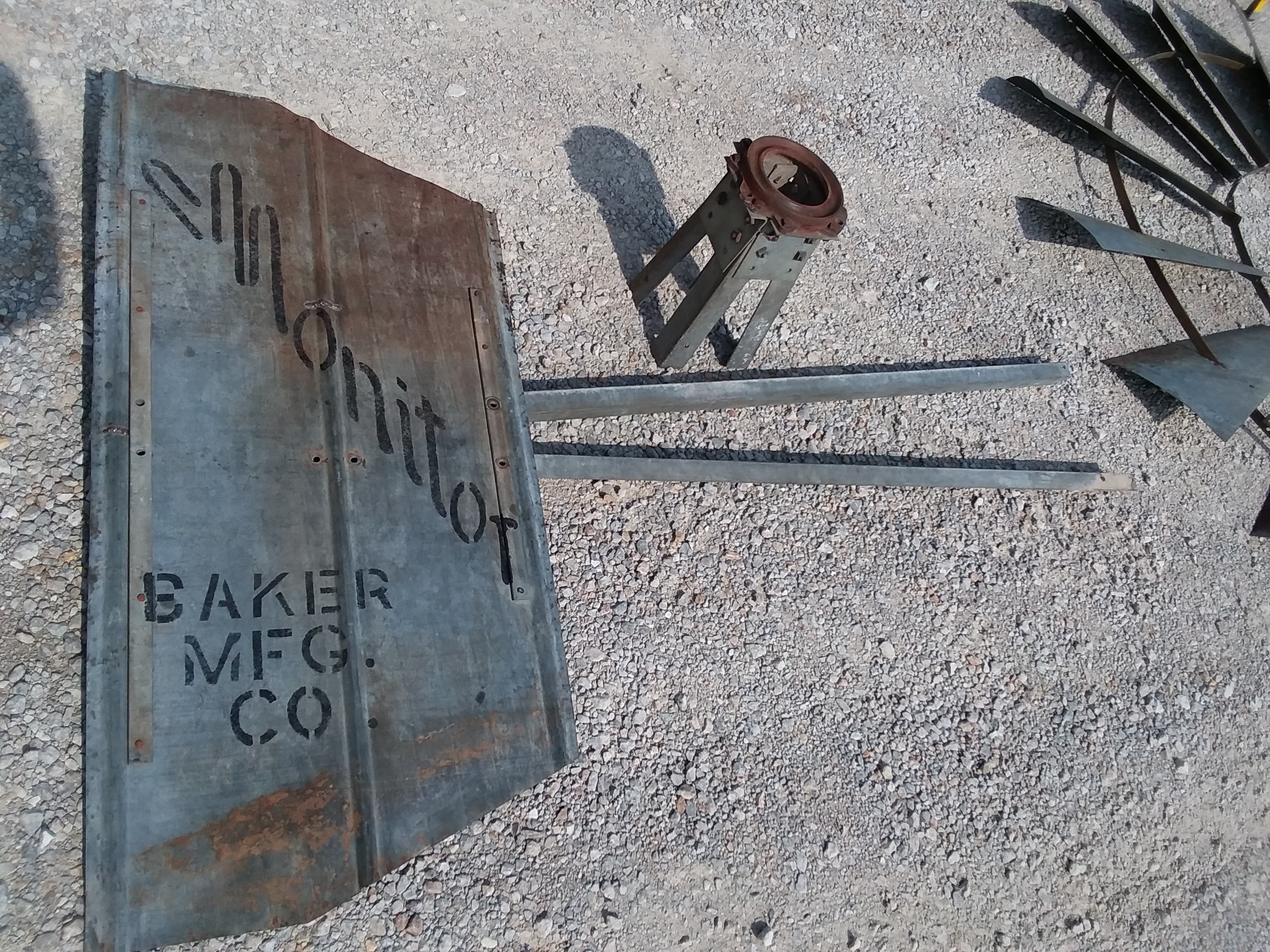 8′ Baker-Monitor WC Windmill head. “Pull-in” style windmill. Exceptionally nice vintage blades and tail vane. Decent lettering on tail (both sides), Thought to be 100% complete with tower cap, motor, wheel arms, stub tower, mast pipe, gov. spring, wheel, tail, tail stem, furling mechanism, and pullout device. New turntable bearings and motor bearings included. Selling in “as is” condition. Overall Great condition and beautiful patina!
