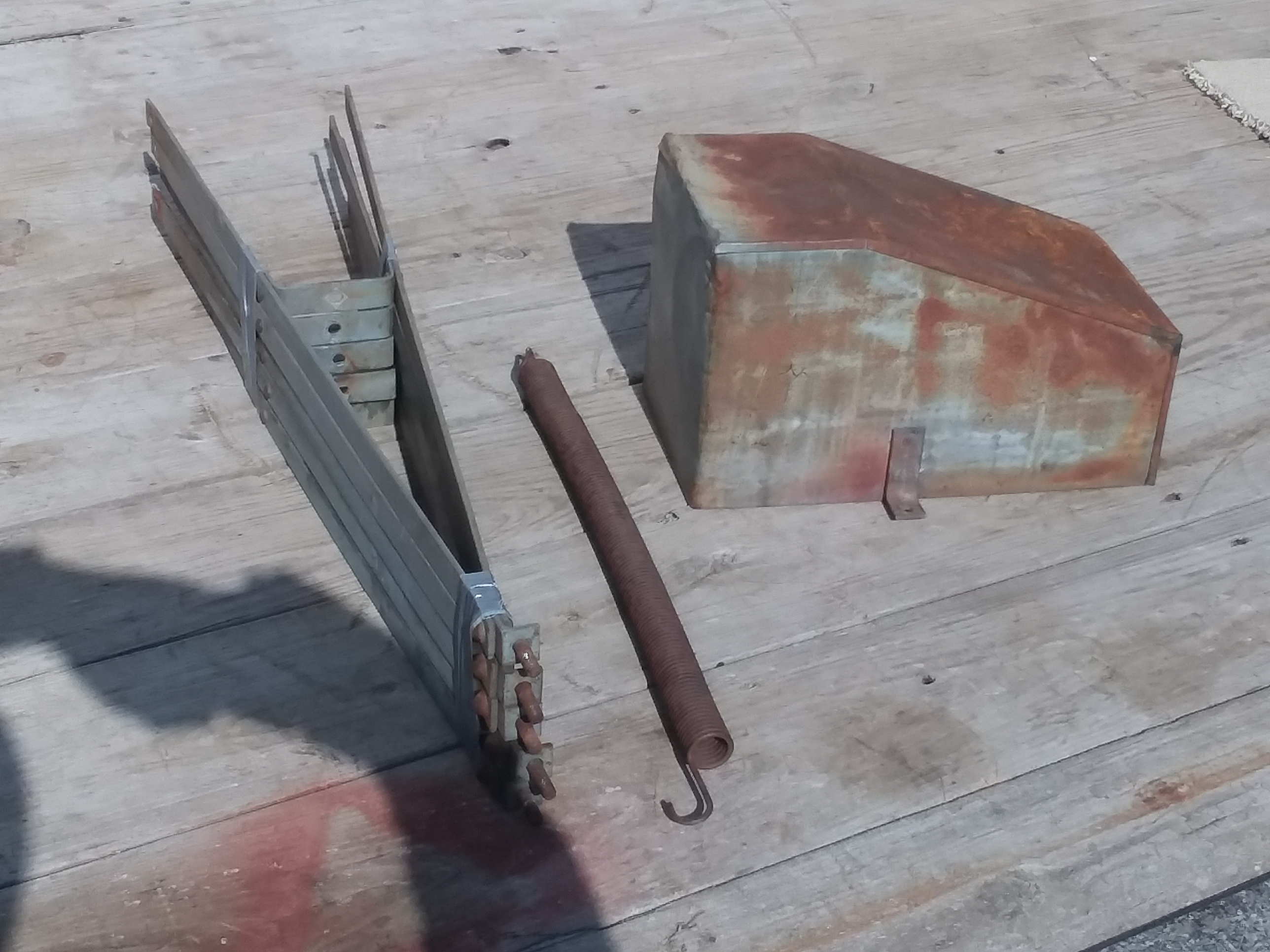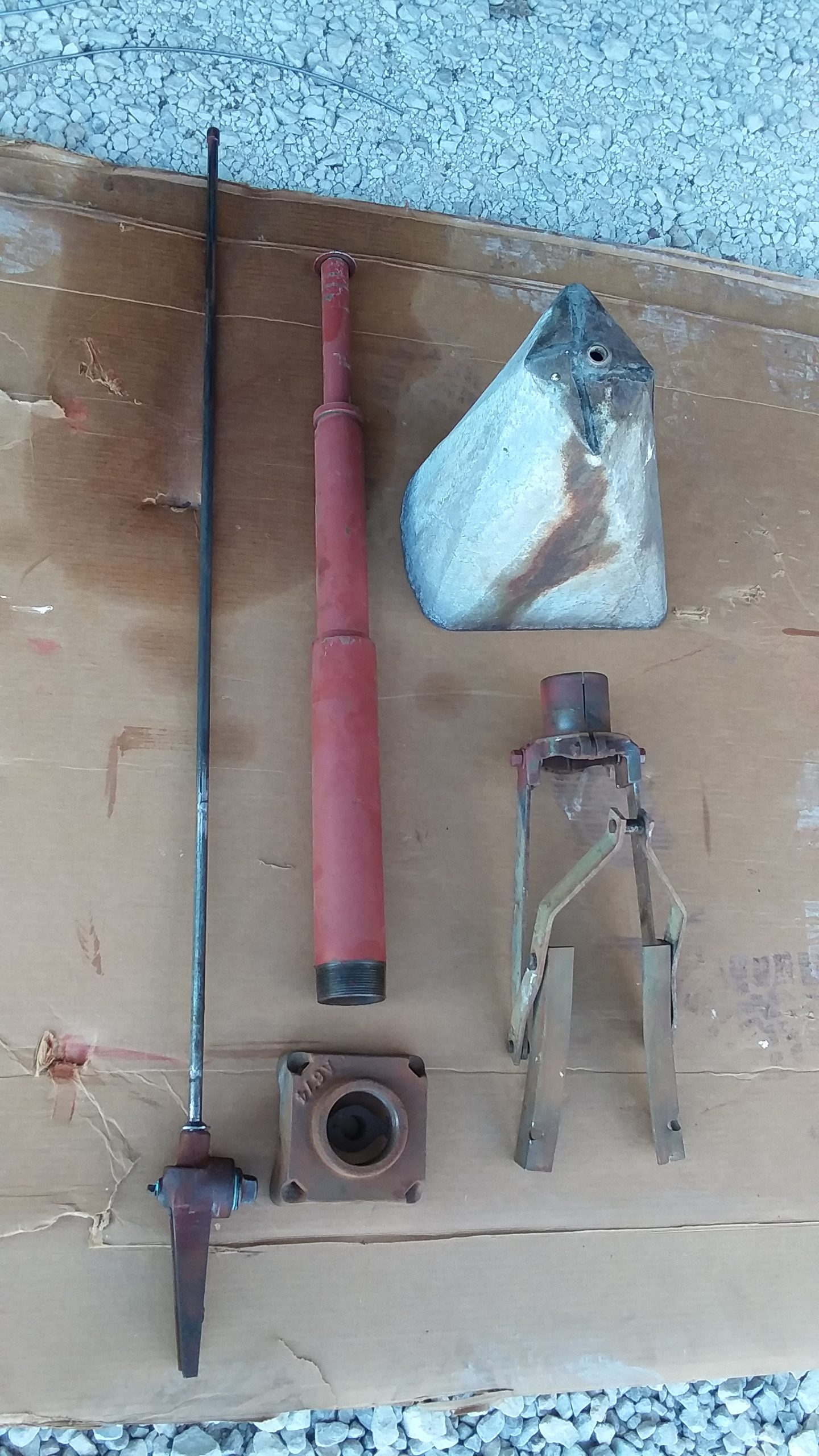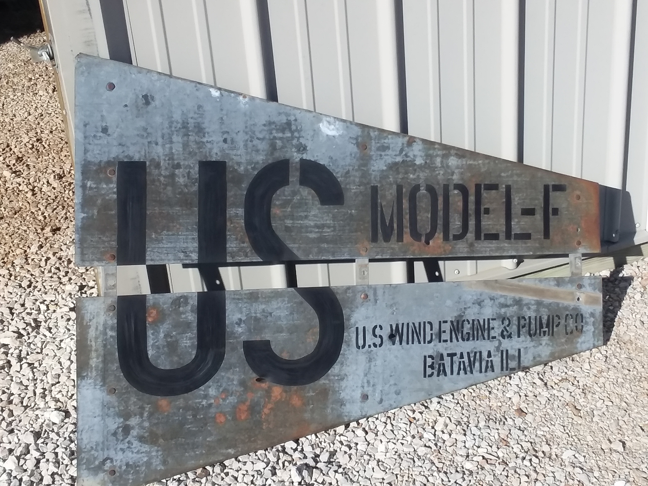 8′ USWE model F (US Wind Engine & Pump Co. , Batavia, IL). Rare, vintage Windmill (circa ~1938). Original blades, spokes, and tail vane are in VERY good condition with great patina! Tail lettering is Very good on BOTH sides. Includes complete wheel, spokes, tail assembly, vane, motor, mast pipe, gov. spring, pump rod, 4′ stub tower, tower cap, centering spider, hood, misc. parts. Motor bearings are serviceable as is. Motor free-spins smoothly. Tail mounting holes are good. Hub is worn on one side. Mill needs only minimal work to fully function properly.