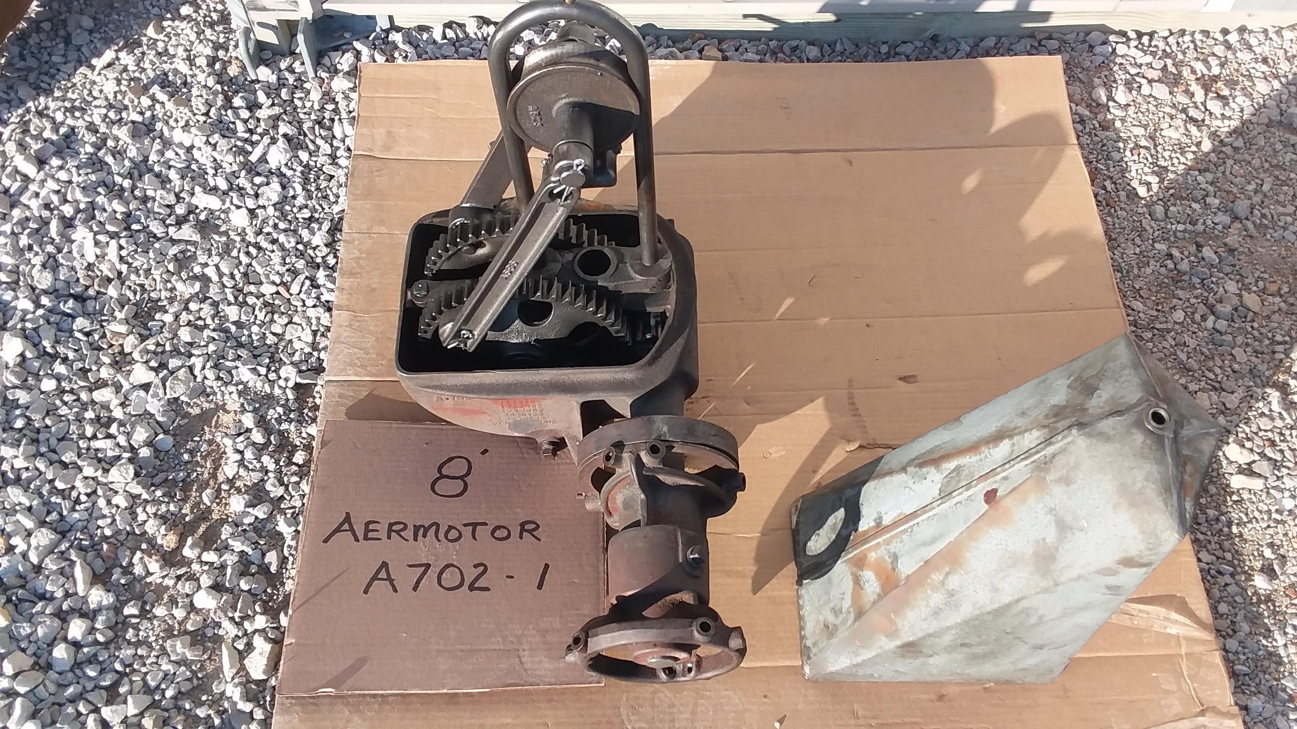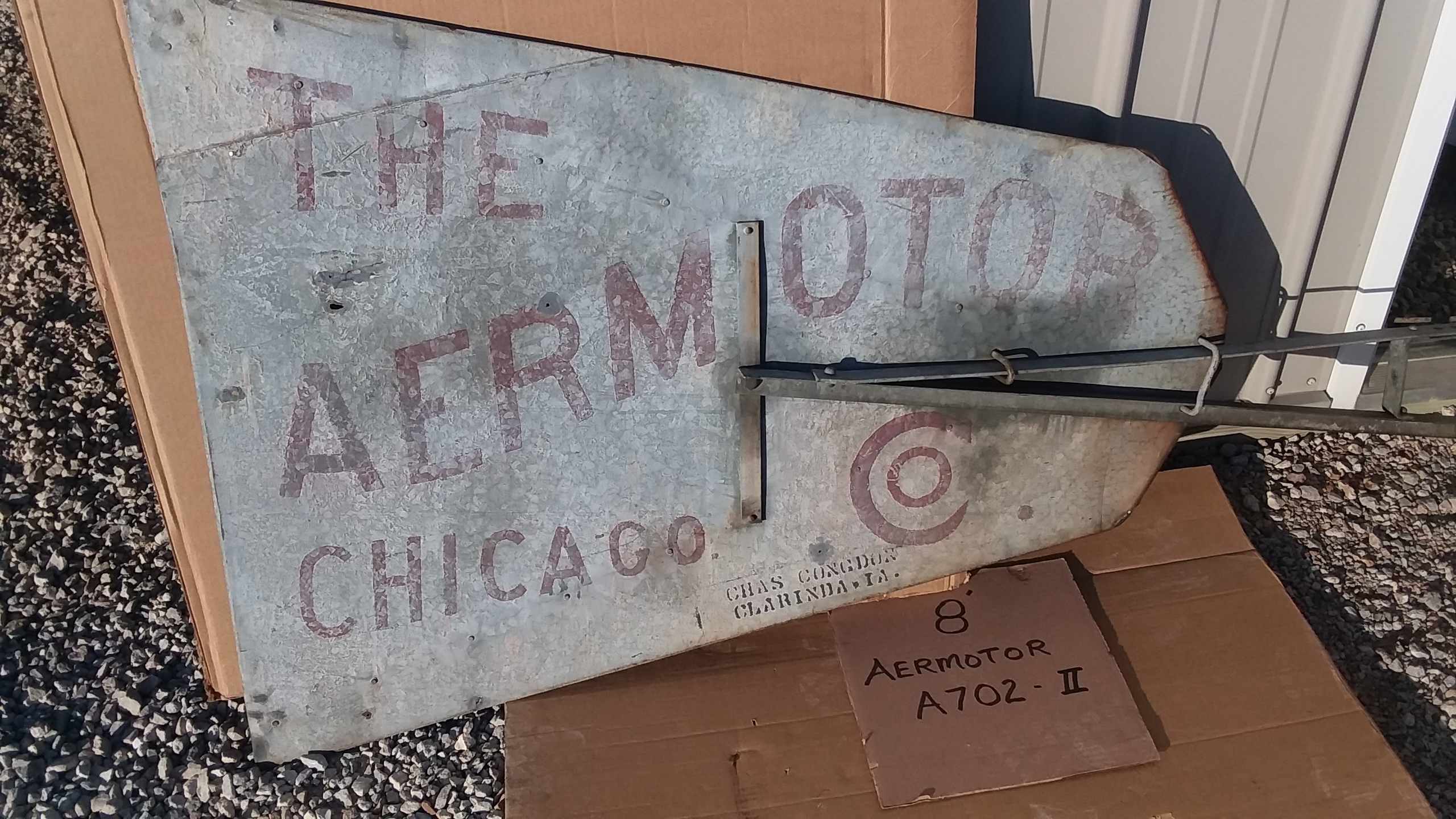 Vintage 8′ Aermotor A702 Windmill Head (A702-I); Used, Rebuilt working windmill. Very nice vintage blades and tail vane. Original lettering on both sides of tail is near perfect! Windmill has been 100% professionally rebuilt and is 100% complete with all parts, castings, motor, wheel arms, mast pipe, gov. spring, complete wheel, tail pin, tail vane, tailbone frame, brake mechanism, brake handle, and furl lever. Vintage blades solid and straight and nearly perfect but do have some oil staining. Full Motor rebuild included new shafts and new bearings. A very nice, original vintage windmill! Great condition and beautiful patina! This vintage windmill is ready to go to work. Has a great old look yet very solid. Complete windmill head only (un-assembled). Various Towers also listed here will fit this windmill.