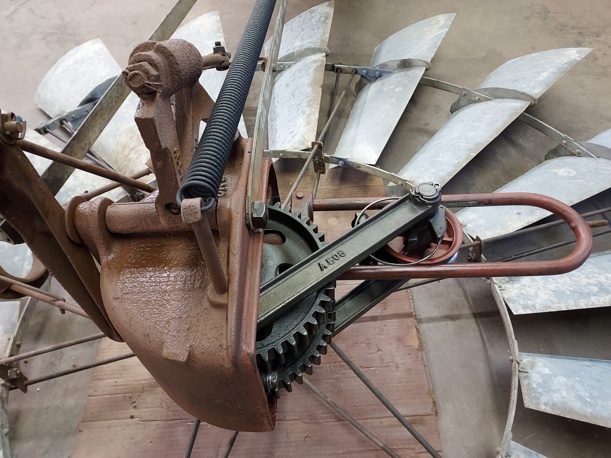 Vintage 8′ Aermotor A702 Windmill Head (A702-II); Used, Rebuilt working windmill. Very nice vintage blades and tail vane. Original lettering on both sides of tail is near perfect! Windmill has been 100% professionally rebuilt and is 100% complete with all parts, castings, motor, wheel arms, mast pipe, gov. spring, complete wheel, tail pin, tail vane, tailbone frame, brake mechanism, brake handle, furl lever, and manual. Vintage blades are matching, solid, straight, and nearly perfect. Vane is great and has little oil staining for character. Full Motor rebuild included new shafts and new bearings. A very nice, original vintage windmill! Great condition and beautiful patina! This vintage windmill is ready to go to work. Has a great old look yet very solid. Complete windmill head only (un-assembled). Various Towers also listed here will fit this windmill.