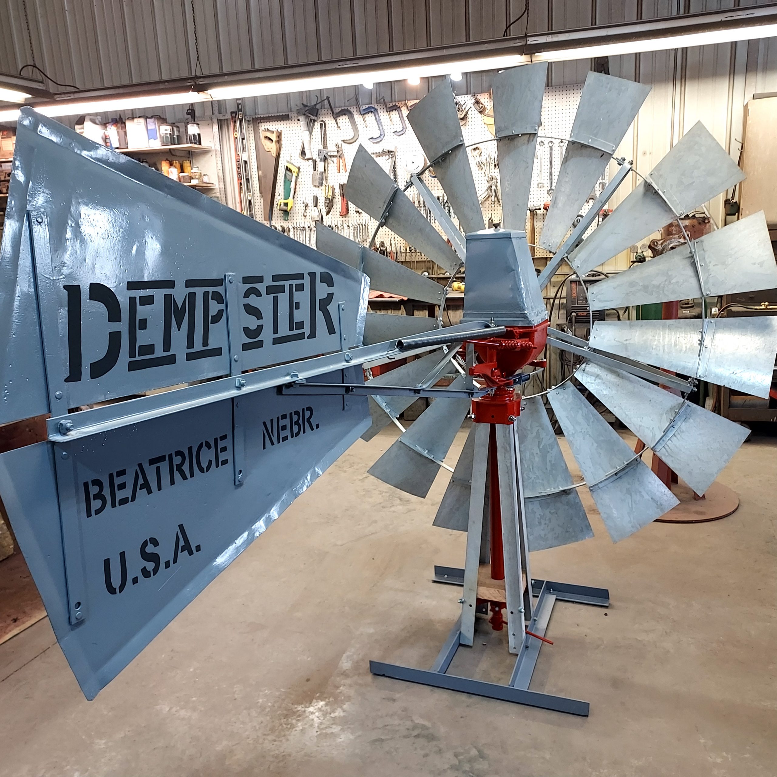 6′ Dempster model 12. 100% professionally rebuilt, including all new bearings and shafts, new hot galvanized wheel & spokes, new pullout, brake, gov. spring, turntable bearings, 3′ stub tower. Vintage logo painted on vane. Tower available for extra.