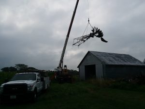 With the junker windmill in the tall weeds, behind the barn, and the corn planted right up to it, this windmill began it’s rebuilding journey by flying out of that tight spot! After rebuilding the A702 and adding 10′ to the tower height, it is once again spinning near West Point, IL 2019.